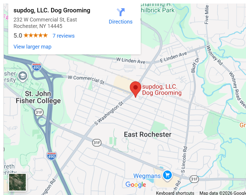 We’re located in the heart of East Rochester NY, making it easy to drop off and pick up your pup. Our grooming studio is clean, calm, and easy to find — with convenient front door parking and a welcoming space for every visit.